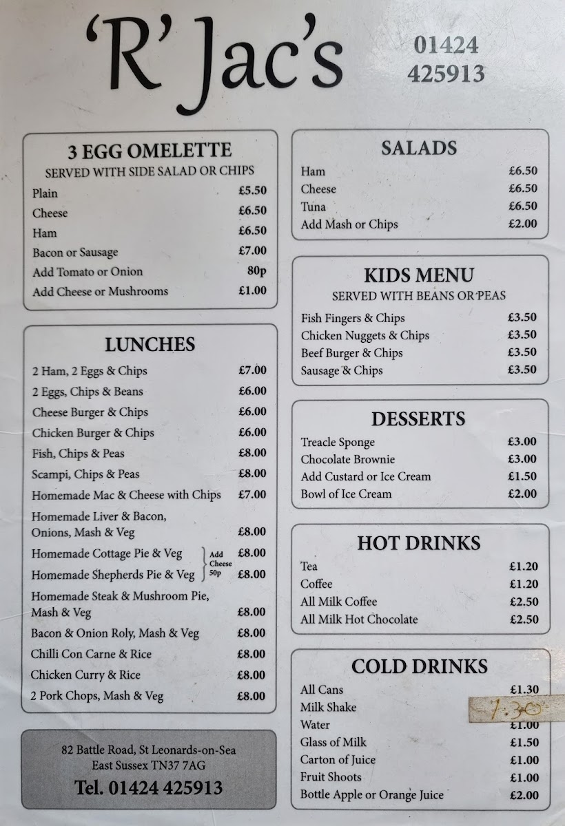 The menu at R Jac's offers a selection of traditional café fare suitable for breakfast, lunch, and light meals throughout the day. Visitors can expect a range of food and drink options commonly found in a local café setting, including hot beverages, hearty breakfast items, and simple lunch plates.